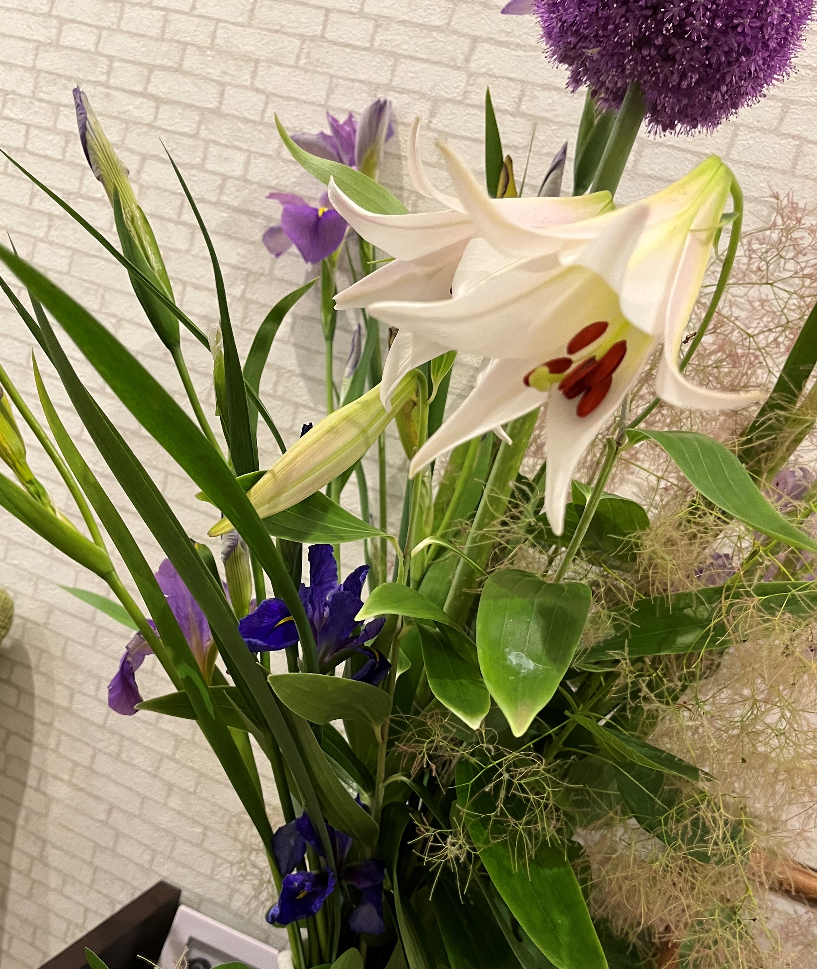 朝いただいたスモークツリー、あやめ?ボンボン?ささゆり。