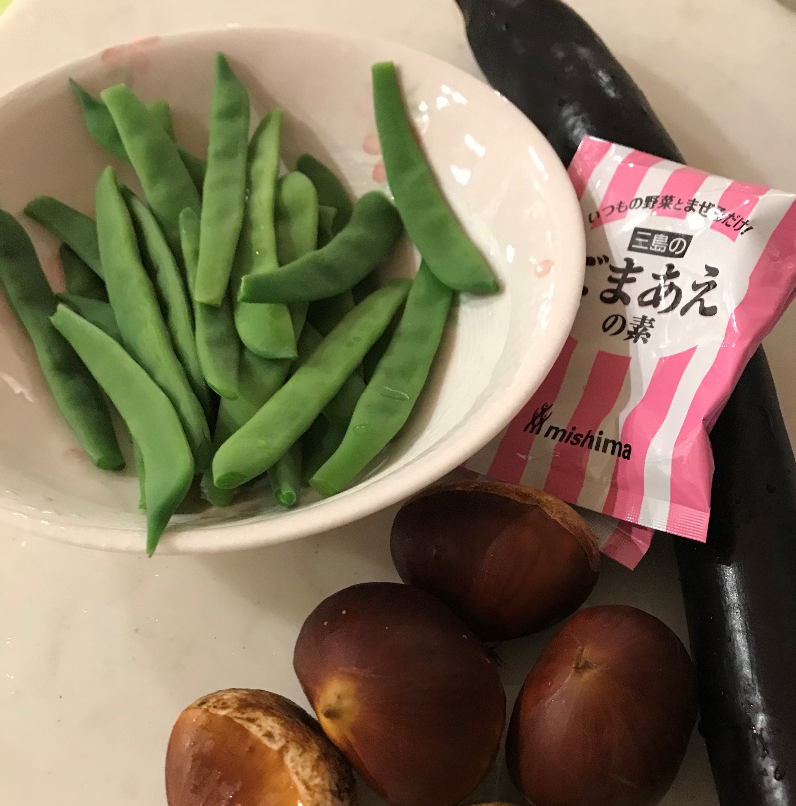 採れたてインゲンと味がついているすりごま付きも持ってきてくださり、遠慮もなく すぐに「いただきまあ~す」 ナスも遠慮なくもらっやいました。